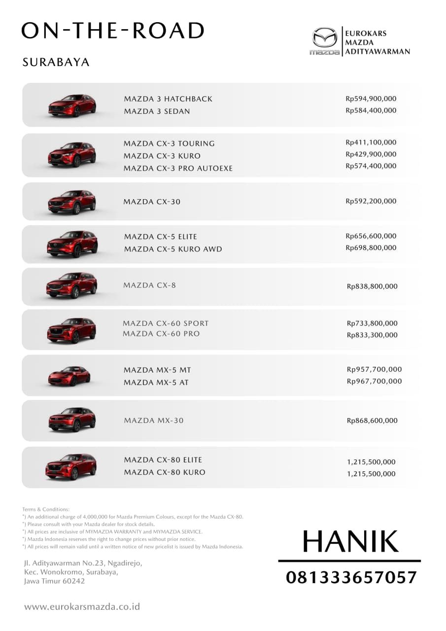 Official Website Dealer Resmi Eurokars Mazda Adityawarman - Surabaya, Jawa Timur, kami memberikan segala kemudahan dan kepuasan pelanggan untuk memilih mana varian mobil yang diinginkan. Menjadi prioritas utama kami untuk menciptakan kenyamanan pelanggan.